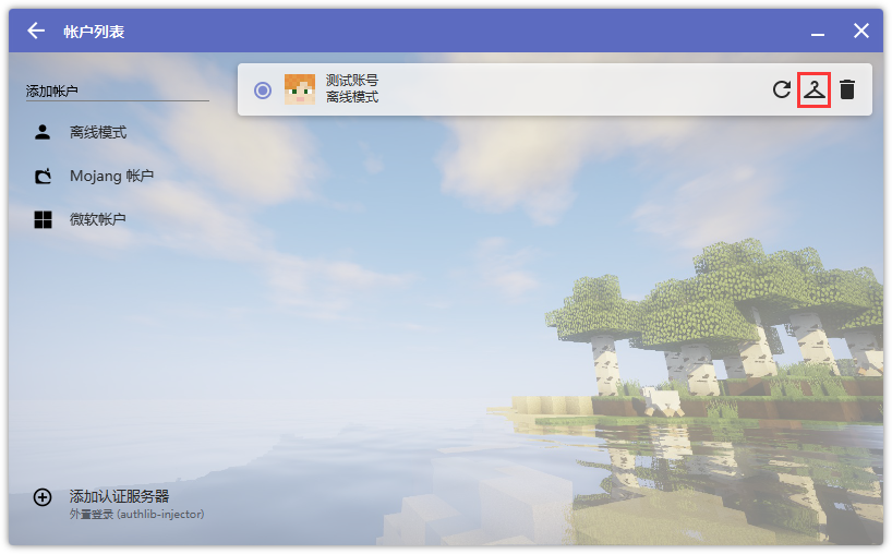 打开HMCL, 进入 账号列表 , 点击下图离线账号的【上传皮肤】红框处: